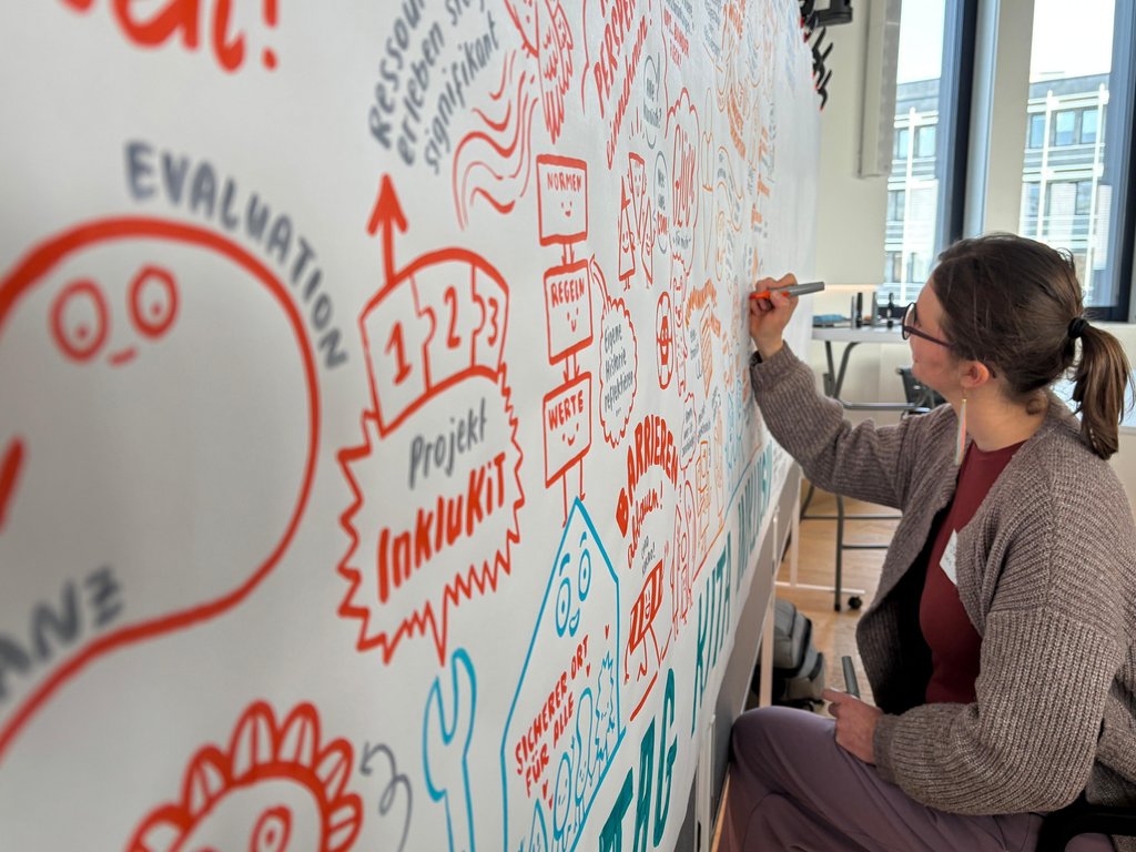 Am Nachmittag wurden die fachlichen Impulse in sechs thematisch unterschiedlichen Workshops praxisnah vertieft. Von der inklusiven Konzeptionsentwicklung über den alltagstauglichen Einsatz unterstützter Kommunikation bis hin zu einer Methodenwerkstatt zur Gestaltung von Teilhabe im Kita-Alltag: Der Austausch mit den Referenten und die Gruppenarbeit ermöglichte konkrete Einblicke in unterschiedliche Themen und gab den Fachkräften hilfreiche Tools für den pädagogischen Alltag in den Kitas an die Hand. Ein Graphic-Recording dokumentierte außerdem die zentralen Inhalte des Tages visuell und verband die unterschiedlichen Perspektiven miteinander. Mit den farbenfrohen Zeichnungen lud das Bord die Teilnehmerinnen und Teilnehmer auch in den Pausen dazu ein, sich noch einmal über die Fachvorträge auszutauschen. Im Abschlussplenum wurden Eindrücke zusammengeführt und in den weiteren Entwicklungsprozess der Kitalandschaft im Zuständigkeitsbereich des Kreisjugendamtes eingeordnet.
