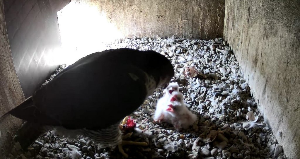 Mit Blick auf die nahe Zukunft erwartet die Untere Naturschutzbehörde an ihrem Nistkasten mit Kameras, dass die Wanderfalken-Küken ihre Augen öffnen und Gefieder bilden. In Wechselschicht von Wanderfalkenvater und -mutter werden sie gewärmt, geschützt und versorgt. Ab dem 20. Tag erfolgen die ersten Eigenbewegungen. Bereit für erste Flugversuche sind sie ab etwa dem 32. bis 42. Tag. Unter Schutz ihrer Eltern erreichen sie nach etwa weiteren zwei Wochen ausreichend Flugsicherheit und können Gefahren besser erkennen. Danach verlassen sie den Kasten und suchen eigene Reviere beziehungsweise Partner. Bis dahin ist für die Wanderfalken-Küken aber noch viel Zeit.